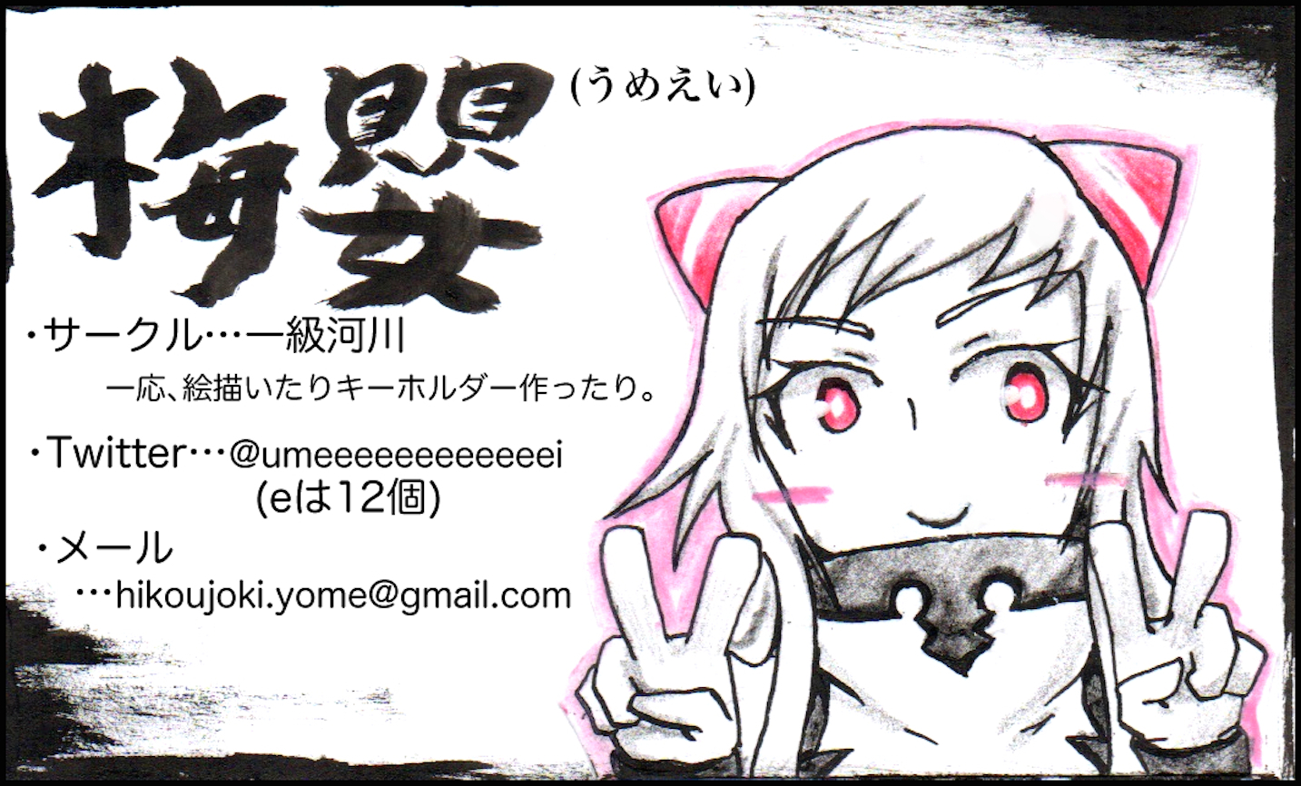 サークル「一級河川」のブログです。 活動内容は、同人でのグッズ作りや同人誌、コスプレなど多数。 一応書き込みは基本的にサークル主のざしきたかがやらせてもらっています。サークルメンバーの近況や、イベント告知などを行っています。 メンバー絶賛募集中。「hikoujoki.yome@gmail.com」までメールをしていただければと。 【メンバー紹介】 ・ざしきたか…わたしです ・夜雲(やくも)…サークル副長?イラスト関係、写真等。 ・海凜(かいり)…サークルマスコット?写真が主。
